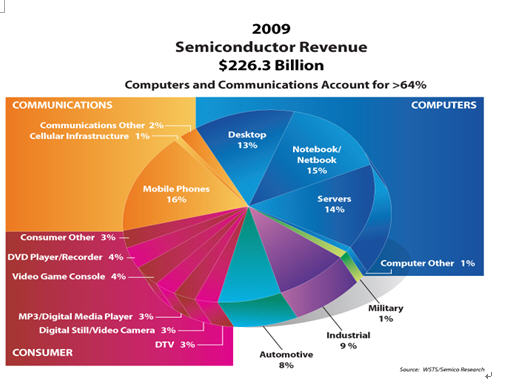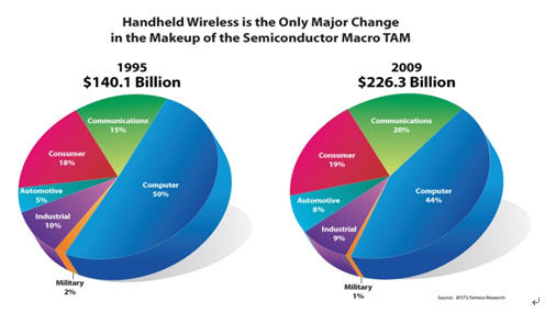 那么未來將會是怎么樣呢?只要晶體管的數量按目前的高增長倍率繼續走下去,各種新的應用會層出不窮,推動半導體市場總量進一步提高。因此全球半導體市場在近15年來看似十分穩定,雖然如臺式計算機市場已經飽和,但是筆記本電腦和上網本開始流行,加上消費類電子產品如游戲機,平板電視,MP3, 數碼相機等, 由于半導體含量的增加推動了半導體TAM的增加。