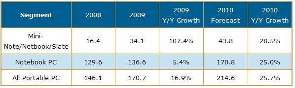 隨著平板電腦市場加溫,DisplaySearch以為2010年上網本及平板電腦將是最快速成長的應用別。同時由于開發中國家需求增加與下半年商用市場復蘇,傳統翻蓋式筆記本電腦也將持續增長。對于2010年全球筆記本電腦市場總量估計可達2億1千5百萬臺,年增長率為25.7%。