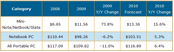 展望2010年筆記本電腦市場,出貨量將有強勁增長同時銷售價格降幅趨于緩和,使得便攜式電腦市場的營業額能達到1千170億美金,恢復到2008年的水平。上網本與平板電腦將是營收增長最高應用別,主要是由于高單價產品的推出;不過上網本平均銷售價格將由2009年每臺400美元下滑到每臺300美元;而Apple iPad將是該應用別主要出貨貢獻,平均單價從入門機種每臺499美金到高階機種超過每臺800美金之上都有。