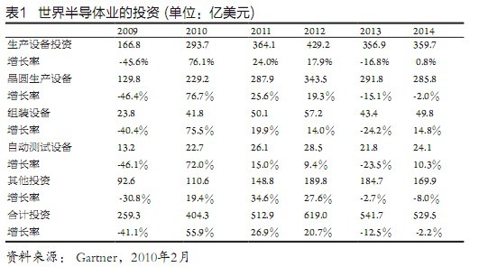 近期半導體業的迅猛增長,推動了半導體生產設備市場的快速復蘇,存儲器、代工業的發展以及進一步走向微細化先進技術的要求,則是主要的拉動力量。在各項生產設備中晶圓生產線(wafer fab)設備最為重要,增長也最快,2010年將竄升76.7%,達229億美元,獨占半導體生產設備的78%,整個半導體業投資的近57%。組裝設備增長75.5%,達41.8億美元,自動測試設備增長72%,達22.7億美元。其他有關投資增長19.4%,達110.6億美元,整個半導體業投資共增長55.9%,達到404.3億美元(表l)。