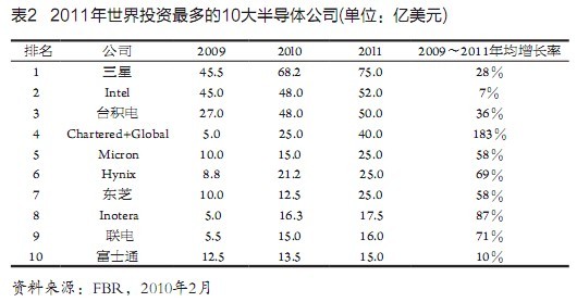 又據FBR市場調研公司發表的報告,世界半導體業的總投資額2009~2011年分別為257億美元、406億美元和495億美元,和Gartner公司所報基本相同。該公司又稱,這3年世界最大25家半導體公司的投資,占到整個半導體業投資的近90%。2009~2011年世界投資最多的l0家半導體公司如表2所示。