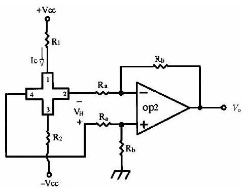 磁場強度可利用形成在結晶片的一部份的霍爾組件變換成電氣信號(參照前述霍爾組件的作用原理)。結晶通常使用半導體硅,霍爾組件的磁場靈敏度為10~20mV/K.Oe。此信號經形成在同一結晶中的信號處理電路放大后,作為適合所定目的的信號電壓被取出。通常四根導線中的兩根連接于一方接地的電源,而從剩下的兩根的一根取出正極性的信號電壓,并從另一根取出負極性的信號電壓。霍爾組件的輸入電阻通常需符合信號處理電路的電源,以便可利用定電壓使用霍爾組件。此時組件的輸出電壓不管在N型或P型均無大差異。又因輸出電壓與電子或正孔的移動度成正比,故溫度特性也應該盡量保持一定,這是與單體霍爾組件不同的地方。