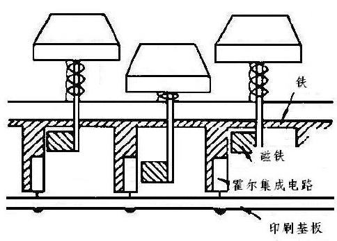 霍爾集成電路通常使用于前述磁電變換組件的項所述的(A-1)、(A-2)范圍的用途,在這些用途的中,特別像開關那樣,以磁氣為媒介將位置的變化、速度、回轉等的物理量變換為電氣量時,使用起來非常簡單。使用霍爾集成電路的開關系如圖2-21所示,這種開關具有:(1)無震動(Chattering),(2)不生雜音,(3)使用壽命長,可靠度高,(4)響應速度快等特征,已經實際被使用作為高級的鍵盤用開關。