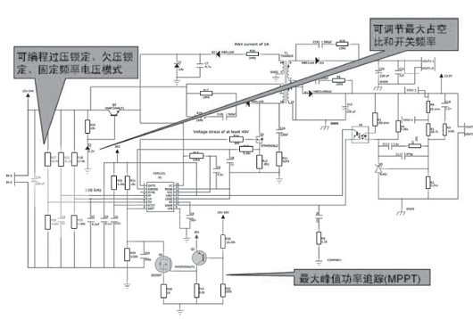 在應用中,通過在ISET引腳動態調節電流限制,從而實現最大峰值功率追蹤功能。一旦輸入電壓逐脈沖下降,電流限制就會被降低,直至輸入電壓恢復。這種方式無需使用價格昂貴的微控制器。這樣實現的充電控制器會發現峰值功率點并進行動態調節,使其符合不斷變化的電源特性。實際上,通過采用最大峰值功率追蹤技術,可以將較以往多30%的電荷從太陽能板傳輸至蓄電池,這樣太陽能街燈系統就可以采用尺寸更小的太陽能板,從而帶來顯著的成本效益。圖1是采用安森美半導體CS51221控制器的太陽能板充電控制應用示意圖。
