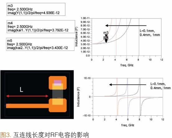 圖3是RF頻段下單個SMD焊盤的互連線長度對電容影響的簡單實例。在這種情況下,3.0pFSMD電容的一個電極連接在M2層上,形成接地電容。100.0μm寬的互連線與另一個電極連接在一起。在2.5GHz頻段下,1.0mm長的互連線可使SMD電容器的等效電容增長到4.9pF(增大了63%)。當然,互連線越短,等效電容與本征電容(3.0pF)的值就越接近。然而,通常使用長互連線連接SMD元件是不可避免的。在這種情況下,考慮互連線對電容的影響就顯得異常重要(有時把這種方法稱為對電容的微調),否則SiP將無法正常工作。