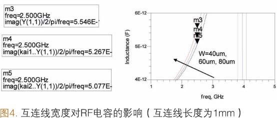 [page]除互連線長度之外,互連線的寬度也會對RF電容產生影響。在襯底的制作過程中,線寬通常會發生變化(舉例來說,與設計寬度相比,實際線寬的變化范圍為±10.0μm~±15.0μm)。如圖4所示,如果設計的互連線為1.0mm長,60.0μm寬,實際卻達到40.0μm寬,在2.5GHz下等效電容變化將達到5.3%(以3.0pF接地SMD電容為例)。如果把這種SMD電容用于濾波器中,對于RF應用來說,電容值5.3%的變化將導致約2.7%的頻移。我們必須對RF應用中含有SMD電容的RFSiP模塊的襯底制造容差進行細致研究。