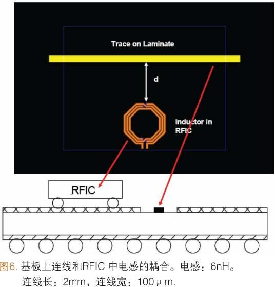 為了對主時鐘線和RF元件之間的相互作用進行分析,把壓控振蕩器(VCO)中使用的RF電感(6.0nH)放置在穿通多層襯底的時鐘互連線附近(圖6)。我們在這個研究中使用的互連線長為2.0mm。當VCO電感和互連線之間的橫向距離(d)大于0.5mm時,產生的耦合信號將小于-80.0dB。耦合信號的實際要求由SiP系統級電設計決定。