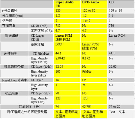 DVD-Audio提供了空前的高質量音頻回放潛力,不過,DVD-Audio并不是唯一的高質量音頻標準。Sony和Philips也已經合作開發了一個稱為DirectStreamDigital(DSD)的競爭標準。1999年在日本公布的SuperAudioCD)與PCM格式CD和針對數字音頻的DVD標準不兼容。?(SACD