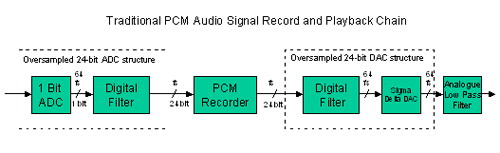 數字音頻的最常見數據格式是脈沖編碼調制(PCM)。CD使用以44.1kHz采樣頻率錄制的16位PCM數據,DVD-Audio盤也使用PCM數據格式,因此用來處理DVD-Audio數據的技術與CD是一樣的。典型的系統架構如下圖所示。注意:在sigma-deltaDAC之前,有一個數字濾波器用來處理過采樣和防止圖像抖動。