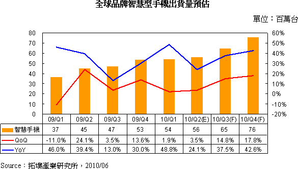 受到新興市場換機(jī)潮與新用戶的加入,以及成熟歐美市場新規(guī)格、新應(yīng)用的持續(xù)推出等因素激勵,拓墣產(chǎn)業(yè)研究所預(yù)估2010年全球品牌手機(jī)出貨量可望達(dá)13.29億支,較2009年成長11.7%,2010下半年出貨表現(xiàn)將優(yōu)于上半年,通訊產(chǎn)業(yè)研究中心謝雨珊副理分析,在智慧型手機(jī)快速低價化、iPhone 4上市之下,促使品牌廠相繼推出新款智慧型手機(jī)搶市,預(yù)估2010年全球智慧型手機(jī)出貨量為2.51億支,年成長率達(dá)37.9%,連續(xù)三年以超過30%以上高成長率攻占市場,2011年全球智慧型手機(jī)出貨量更挑戰(zhàn)4億支關(guān)卡,滲透率將從2010年的18.9%,攀升至2011年的27.6%,屆時每四款手機(jī)中即有一款是智慧型手機(jī)。
