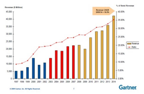 桉Gartner觀察,在明年的Q4時(shí),僅TSMC,GlobalFoundries及三星加在一起,在45nm及以下制程的300mm硅片月產(chǎn)能達(dá)約280,000片,而2009 Q4時(shí)僅70,000片。今年TSMC與GlobalFoundries兩家計(jì)劃總投資達(dá)79億美元。