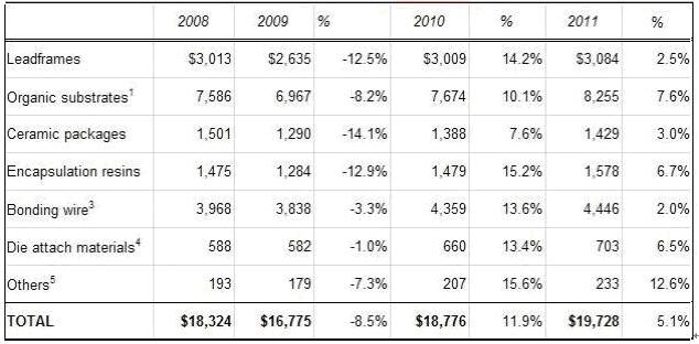 預測2011年封裝材料將下降到個位數的增長, 雖然其它others類包括如硅片級封裝WLP的介質材料及焊球, 它們的增長率都在低的兩位數。注意到鍵合線在2011年減緩, 看到幾乎很少有的2%增長, 但還是比引線框架leadframes多(盡管leadframes出貨量己經超過下降周期之前水平)