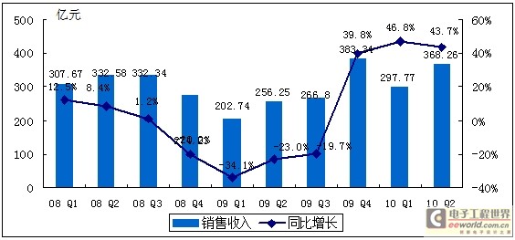 2010年上半年中國集成電路產(chǎn)量為302.5億塊,同比大幅增長了49.4%,行業(yè)實(shí)現(xiàn)銷售收入666.03億元。與2009年上半年458.99億元銷售額相比。增長了45.1%。上半年的高增長主要得益于國內(nèi)外市場(chǎng)的快速增長,以及去年上半年行業(yè)低谷的低基數(shù)效應(yīng)。整體來看,今年上半年產(chǎn)業(yè)銷售額不僅已恢復(fù)到2008年上半年的規(guī)模(2008年上半年產(chǎn)業(yè)銷售額為640.25億元),更在此基礎(chǔ)上實(shí)現(xiàn)了一定的增長。
