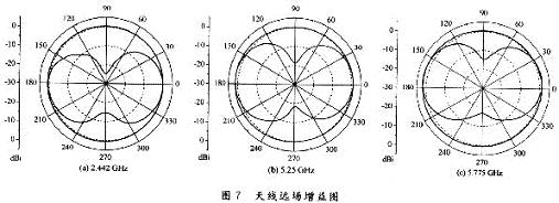 圖6示出了非均勻彎折線單極子天線的回波損耗曲線。從圖中可以看出,仿真結(jié)果與實(shí)際測(cè)試結(jié)果比較吻合。低頻段測(cè)得的阻抗帶寬(S1-1<-10dB)約為O.5GHz(2.2~2.7GHz);高頻段實(shí)際測(cè)得的阻抗帶寬(S11<-10dB)約為1.8GHz(4.48~6.28GHz)。圖7(a)~(c)分別示出了非均勻彎折線單極子天線在2.442GHz,5.25GHz和5.775GHz時(shí)的增益圖,增益分別為0.7dBi,1.65dBi和2.3dBi。
