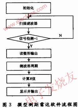 雷達(dá)工作時(shí),單片機(jī)控制窄帶濾波器不斷的進(jìn)行掃描,當(dāng)某一個(gè)濾波器有信號(hào)時(shí),由可重觸發(fā)單穩(wěn)態(tài)電路組成的信號(hào)檢測(cè)電路輸出由“0”變?yōu)?ldquo;1”,單片機(jī)根據(jù)輸出的窄帶濾波器獲得帶內(nèi)頻率,判斷出精度不太高的距離范圍,利用放大整形輸出進(jìn)行計(jì)數(shù)或測(cè)量脈沖的周期,獲得足夠精確的頻率值,即為準(zhǔn)確距離。根據(jù)公式計(jì)算出R和V送顯示器予以顯示,或通過(guò)RS232串口送上一級(jí)的計(jì)算機(jī)系統(tǒng)。