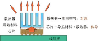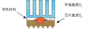 如圖1所示,目前比較常用的一種散熱方式是使用散熱器,用導熱材料和工具將散熱器安裝于芯片上面,從而將芯片產生的熱量迅速排除。本文介紹了根據散熱器規格、芯片功率、環境溫度等數據,通過熱傳導計算來求得芯片工作溫度的方法。