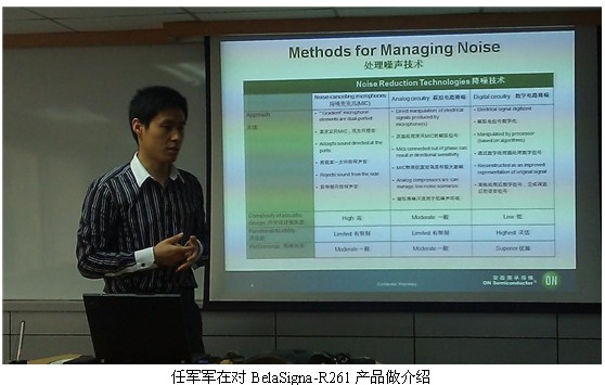 生活在都市的人們通常會(huì)在嘈雜的環(huán)境中撥打或接聽(tīng)電話,人們總是希望能夠像在田野中一般獲得清晰并且沒(méi)有失真的聲音。對(duì)于手機(jī)廠商來(lái)講,采用能夠清晰拾取 語(yǔ)音并抑制噪聲的解決方案是關(guān)鍵。為了應(yīng)對(duì)上述挑戰(zhàn),安森美半導(dǎo)體推出了高性能語(yǔ)音捕獲SoC方案BelaSigna-R261。安森美半導(dǎo)體音頻與助聽(tīng) 器中國(guó)市場(chǎng)開(kāi)發(fā)經(jīng)理任軍軍在日前的產(chǎn)品發(fā)布會(huì)上對(duì)BelaSigna-R261的特性做了介紹,并現(xiàn)場(chǎng)對(duì)產(chǎn)品進(jìn)行了演示。
