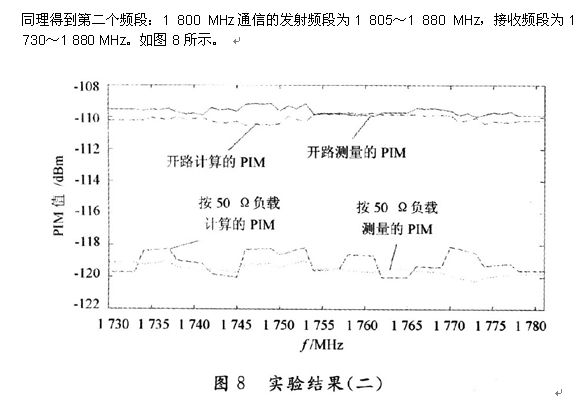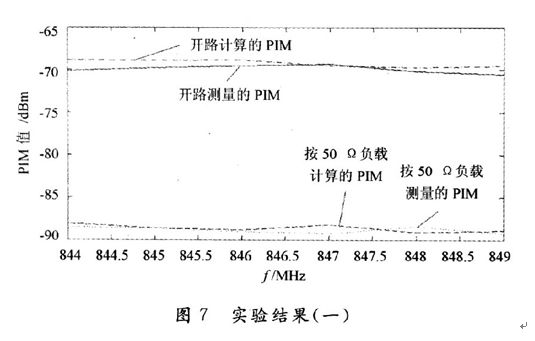 為了驗證該方法的有效性,本文給出了兩個頻段的PIM值的計算與測量結果對比。頻段l:800 MHz的通信系統的發射頻段為869~894 MHz,接收頻段為824~849 MHz。如圖7所示。