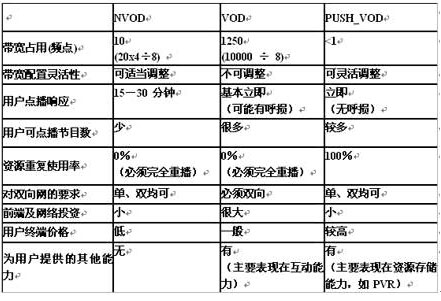 再來看看PUSH-VOD和其它的VOD的比較,看看有哪些優點和缺點。首先做個假設,在50萬個城市進行點播,假如有1萬個用戶需要點播的業務,我們電視臺每天播出20套熱門節目,每個臺點播8個節目,每套節目在NVOD時平均分4節來播放。比較一下,對于NVOD來講需要占用的頻點資源是8個頻點,PUSH-VOD需要占用10個頻點。對于VOD來講不存在這種算法的概念,有多少個用戶就需要集中多少的帶寬、頻點。對PUSH-VOD來講,絕大部分的用戶都下載到了硬盤了,用的是本地資源不是帶寬資源。