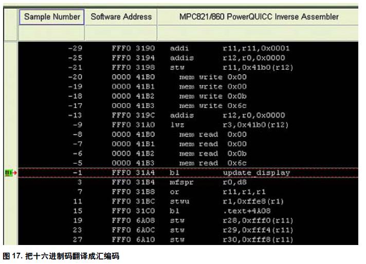 在使用處理器時,特定的十六進(jìn)制字符包含一個處理器指令。如果您很熟悉十六進(jìn)制代碼,就能查看這些類似圖13 所示的十六進(jìn)制代碼表,并知道它們代表的指令。但我們大部分人做不到這一點。因此,絕大多數(shù)分析儀制造商設(shè)計了稱為反匯編器的軟件包。這些軟件包把十六進(jìn)制代碼轉(zhuǎn)換成易于閱讀的匯編碼。例如圖13中有0000 41B0 和0000 41B1。我們可以從MotorolaPowerQUICC 手冊中查到它們代表存儲器寫0x00 指令。反匯編器可以為我們做這些事情,使我們不需要查找這些代碼。請查看圖17 并注意它們之間的差別。