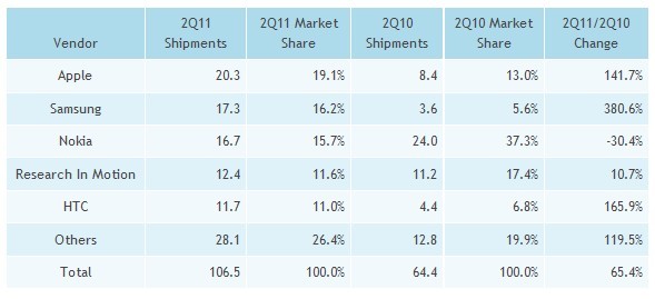 - 2011年第二季智能手機市場成長了65.4%