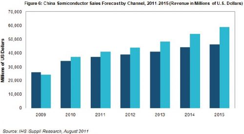 圖中所示為IHS iSuppli公司對中國半導體銷售額的預測,按渠道細分。