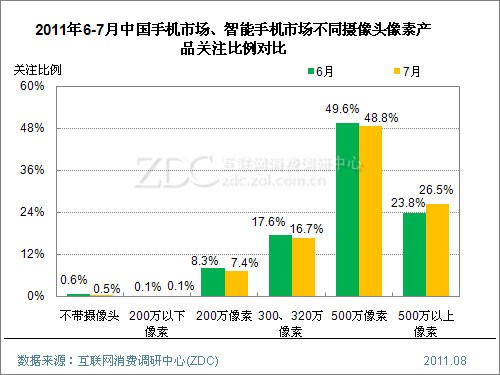 ZDC統計數據顯示,7月中國智能手機市場在售智能手機中,攝像頭像素在500萬以上的產品達到180余款,占據智能手機市場16.5%的比例,但從此類產品用戶關注度來看,本月卻達到26.5%,較6月顯著增長2.7%。而500萬像素智能手機關注比例本月則小幅下降0.8%。