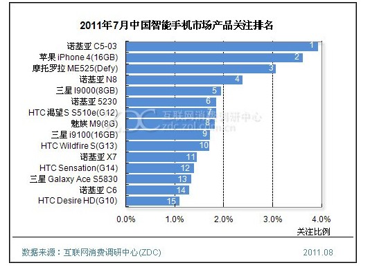與一年前中國智能手機市場前15大產品幾乎被諾基亞包攬格局不同的是,如今,諾基亞產品尤其是智能產品的優勢已經被大大削弱。ZDC統計數據顯示,7月,諾基亞共有5款產品上榜,其中C5-03以3.9%的關注度成為最受用戶關注的產品,但其優勢并不顯著,蘋果iPhONe 4(16GB)以3.6%的關注比例緊隨諾基亞C5-03之后。
