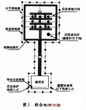 自動氣象站場、室宜采用共用接地系統。該接地系統由工作室地網與室外觀測場地網共同組成,如圖1所示,兩地網間的連接應使用組合式接地體進行連接。連接帶的埋設深度應≥600mm。