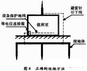 目前,關于共用接地有一種誤解,認為將設備的接地引線無論怎樣連接,最終只要接在同一個接地體上就算是共用接地,如圖3所示。將“共引線”也誤認為是“共地”。其實不然,所謂“共用接地”就是把許多不同性質的接地裝置如電氣安全接地、交流電源工作地、通信及計算機直流地等匯集于一個等電位連接箱,使之成為一個等電位體,然后直接與接地體連接,而防雷地則通過另一條引下線與接地體連接。而不是將室內設備接地與室外防直擊雷接地通過同一根引下線與地相連。更不允許將室內接地引線與室外防直擊雷引線匯集與一個所謂的等電位連接箱,然后再與接地體相連。室內接地引線要遠離室外防雷引下線,如圖4所示。否則,遇雷擊時,強大的雷電流在通過引線向大地泄放的同時,室內引線及所有設備上瞬間便會產生很高的電位差,設備難免遭到破壞。另外,假設與接地體相連的引線因銹蝕斷開或等電位連接端子接觸不良,一旦發生雷擊,強大的雷電流便會直擊至值班室設備上,這是非常危險的。