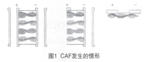 電子產品使用過程中性能是否穩定涉及印制板的使用質量。使用中常遇見印制板的缺陷有:離子遷移(CAF)和焊點質量(Joint)等。銅離子遷移系透過玻纖紗束或紗束與樹脂之細縫,造成兩導體例如(孔壁到孔壁)間出現金屬銅的遷移,其產生機理是:印制板通電后由于電位差,高壓極(陽極)銅金屬在水氣中首先出現腐蝕而氧化成銅Cu2+,于是銅離子會沿著通道緩緩向另一端低壓極進行遷移,同時,低壓端也會往陽極移動,于是兩者在通道途中遭遇后即可還原出金屬銅,形成兩地間的連通即漏電短路,一旦出現短路,電阻頗高的發熱將CAF燒斷,爾后又開始新的CAF。這樣周而復始發生,造成電子產品功能時有時無。如下圖CAF發生的幾種情形。