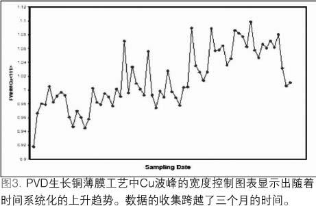 這種設(shè)備最初的一種應(yīng)用是監(jiān)測一系列物理氣相淀積(PVD)的反應(yīng)腔,這些反應(yīng)腔在銅互連金屬化制程中被用來淀積TaN/Ta/Cu襯墊層和籽晶層。這種監(jiān)測作為標(biāo)準(zhǔn)的平面電阻,膜厚量測的補充而存在。薄膜堆棧中Ta和Cu成分的織構(gòu)強度和譜線展寬數(shù)據(jù)都需要收集。TaN層具有無定形結(jié)構(gòu),因此無法監(jiān)測。圖3說明了一個從銅元素峰寬控制圖表中輸出的例子。數(shù)據(jù)的趨勢穩(wěn)步向上,表明PVD銅籽晶的平均晶粒大小隨著時間在減小。圖4說明了在相應(yīng)的Rs圖表中類似但并不十分顯著的增加。隨后的設(shè)備診斷發(fā)現(xiàn)受影響的反應(yīng)腔一個閥門有空氣泄漏的現(xiàn)象。泄漏影響到濺射工藝,進(jìn)而影響銅籽晶層的淀積,這一過程極有可能是在淀積和淀積之后的自退火過程中,由于銅在Ta表面的遷移率下降造成。更換了閥門之后,Rs和銅元素峰寬的值都變小,我們從圖3和圖4控制圖表中的最后三個數(shù)據(jù)點可以看出。