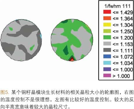 這里舉一個問題診斷的例子,它是因為不良的溫度控制導(dǎo)致某銅籽晶模塊生長的材料晶粒尺寸產(chǎn)生偏移。通過對該模塊生長的銅作日常的平板電阻和膜厚監(jiān)測,并沒有發(fā)現(xiàn)任何異常,但線上的XRD系統(tǒng)顯示相關(guān)的晶粒尺寸有偏移(反向半高寬FWHM)。圖5說明了某個銅籽晶模塊生長材料的相關(guān)晶粒大小的輪廓圖,右圖的溫度控制不是很理想,左圖有比較好的溫度控制。較大的反向半高寬意味著較大的晶粒尺寸。