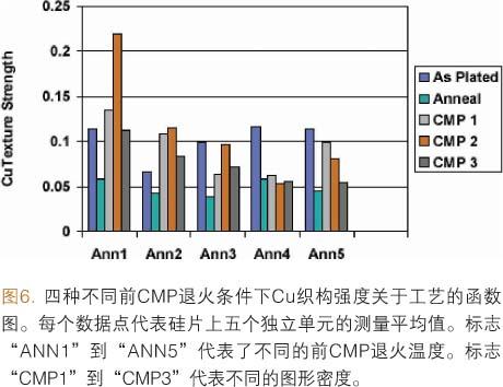 硅片在制程中的三個不同步驟進(jìn)行測量:電鍍之后,前CMP退火之后,金屬化之后。圖6說明了在M1測得的銅織構(gòu)強度的結(jié)果。我們將最終結(jié)果作了平均,因為沒有觀察到銅微結(jié)構(gòu)在硅片中央和邊緣有任何不同。從數(shù)據(jù)中可以看出很多趨勢,但應(yīng)該強調(diào)的是,微結(jié)構(gòu)的數(shù)據(jù)可以與其他線上量測的結(jié)果直接聯(lián)系起來,特別是硅片的良率。所有的結(jié)果綜合起來,可以選擇出該技術(shù)節(jié)點比較優(yōu)化的前CMP退火條件。