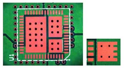 至于版圖布局,金屬較多顯然很有助益。更厚的頂層有助于降低溫度,不過(guò)也許對(duì)PCB的其余部分并不適合,因?yàn)槌杀驹黾恿?其它元件需要的更精細(xì)的間距也不可能實(shí)現(xiàn)。更大的銅面積很有用,但又會(huì)消耗PCB空間。這些應(yīng)該盡可能由焊料覆蓋,因?yàn)榻饘俦砻姹韧科岜砻娴纳嵝愿谩T诙鄬覲CB中,有時(shí)利用內(nèi)層來(lái)協(xié)助散熱。熱通孔 (填充焊料) 有時(shí)可用來(lái)把熱量擴(kuò)散到PCB的另一面去 (圖9)。
