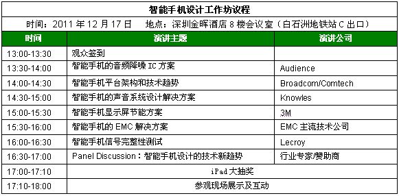 - 智能手機設計工作坊將于2011年12月17日下午在深圳金暉酒店召開