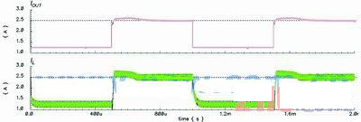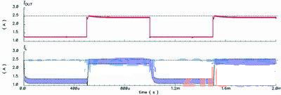 為了說明這個方案,圖1中的降壓轉換器會采用這些配置:L=20mH、COUT=47mF、RL值在2.64W(正常模式)~1.1W(電流限制模式)間轉換,并會使用一個tD=100ns的比較器,而IOUT(CL,DES)和IL(RIPPLE)分別是2.5A和0.3A。不過,如果使用傳統的峰值電流限制方法,那么式(1)中的IV便會設定為2.35A,傳統方法的模擬結果如圖4所示。由此可以看到,IOUT(CL)會由于tD的影響而低于2.5A。然而,使用新方法并將ILR設定在2.5A,IOUT(CL)便可如圖5所示達到2.5A。于是,傳統方法中出現的問題便能夠在該方案中解決。
