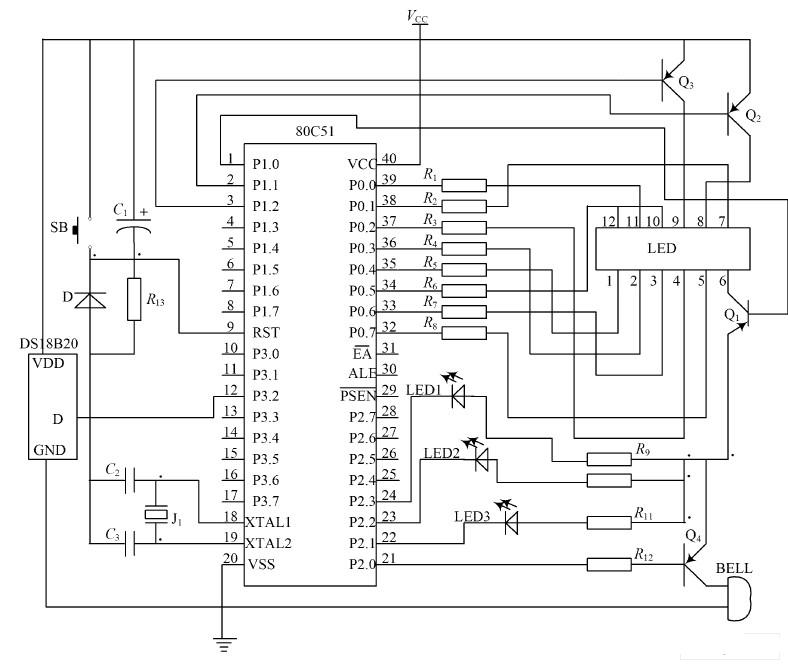 包括信號采集、系統控制、數字顯示、高溫報警四個部分。傳感器DS18B20 為信號采集器件所采集到的溫度信號,通過內部處理由傳感器的DQ 端送到單片機P3. 2 端口,經單片機的計算處理后,由P0 口和P1 口分別作為4 位共陽數碼管的段控信號和位控信號,共同完成對所測溫度值的數字顯示,最高位是符號顯示,如顯示負號“-”時,表示當前溫度是負溫度,否則為正溫度;由P2. 0 端口控制蜂鳴器,當測量的溫度超過“預設報警溫度”時,發出提示音報警; P2. 1~ P2. 3 端口來控制黃、綠、紅3 個發光二極管分別表示低溫、正常、高溫三種溫度狀態。石英晶體JT 和電容C2 ,C3 共同組成晶振電路; 電容C1 、電阻R 13、S B 共同構成復位電路; 其中電阻R13為下拉電阻,SB 為手動復位按鈕。