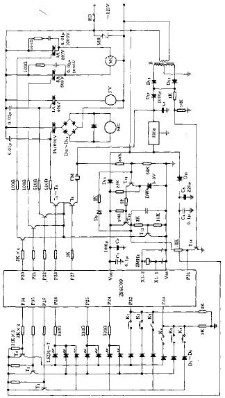 全自動洗衣機由洗衣系統和控制電路組成。其控制電路分為機械和電腦型,電腦型控制電路是以單片機作為控制電路的核心。圖1給出單片機Z86C09組成的全自動洗衣機的控制電路。