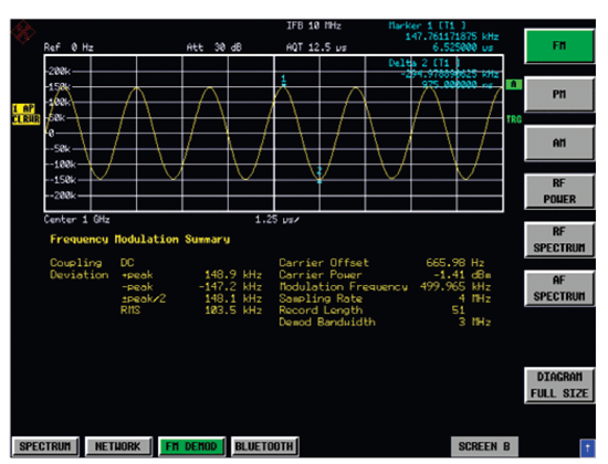 圖6是羅德與施瓦茨公司頻譜儀選件FS-K7在分析調頻信號的應用。它采用上述解調原理,可以實時解調調頻、調幅、調相和實時頻譜。