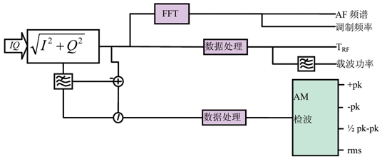 對此數組進行窄帶低通濾波,獲得載波幅度數組Vc ,計算AM-DC與Vc的差分數組,它與Vc的比值AMdeep 數組表述調制深度,對其進行檢波:正峰值 (+pk):數組中的最大值;負峰值 (+pk):數組中的最小值;峰-峰值/2 (1/2pk-pk):數組中的最大值與最小值差值的一半;均方根值 (rms):數組中數值的均方根值。
