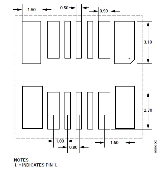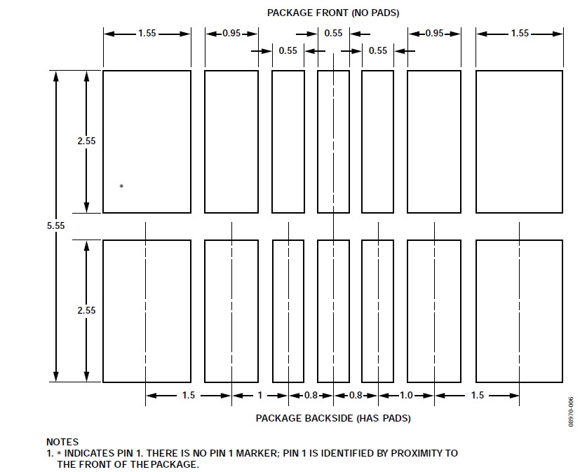 關于垂直和水平安裝方向的CVMP焊盤布局(焊盤圖形),請參閱本應用筆記的"焊盤布局"部分。CVMP背面的焊盤布局如圖7所示。注意,封裝正面上有一些額外的焊盤(見圖4)沒有顯示在焊盤布局中,這些焊盤用作測試點,不應進行電氣連接。