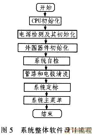 該系統軟件開發采用ATMEL公司提供的AVRStudio開發環境,并在該開發環境中內嵌了支持C語言的GCC。分析儀軟件全部采用C語言編寫,這樣開發周期縮短,維護便捷。該系統軟件設計采用層次化模塊化結構設計,共分為兩個層次,第l層是按照硬件各個功能模塊編寫相應的驅動和接口程序,包括液晶顯示、打印機、按鍵處理、步進電機、A/D采集轉換、系統時鐘、檢測和電源管理等模塊;第2層是在第1層的基礎上按照使用功能編寫的應用程序模塊,有主菜單、樣本分析、質控分析、質控統計、系統設定、系統校準、電極清洗、數據儲存及查詢和系統自檢等模塊。圖5中給出系統整體軟件設計流程。