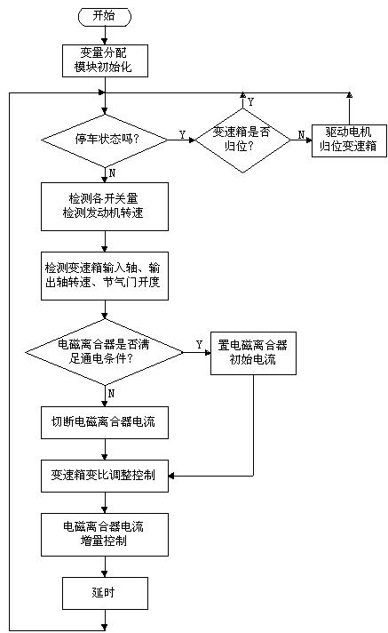 TCU控制系統(tǒng)主程序框圖如圖3所示。程序首先對(duì)內(nèi)部RAM進(jìn)行分配,然后對(duì)各功能模塊如Administrator/D轉(zhuǎn)換器、定時(shí)器、PWM波形發(fā)生器等進(jìn)行初始化。變速箱的變比在汽車每次時(shí)應(yīng)處于最小變比的位置,因此在每次停車時(shí)應(yīng)將變速箱歸位,汽車起動(dòng)后首先檢測(cè)各參數(shù),如檔位開(kāi)關(guān)、發(fā)動(dòng)機(jī)轉(zhuǎn)速、節(jié)氣門開(kāi)度、變速箱輸入、輸出軸轉(zhuǎn)速等。這些參數(shù)是控制電磁離合器電流和電動(dòng)機(jī)狀態(tài)的依據(jù)。當(dāng)需要增加變速箱的變比時(shí),TCU控制電機(jī)正轉(zhuǎn),反之控制電機(jī)反轉(zhuǎn)。電磁離合器的控制采用電流增量控制方式。它的控制好壞,直接影響汽車運(yùn)行的平穩(wěn)性和經(jīng)濟(jì)性。