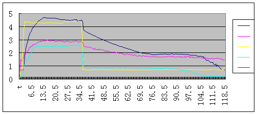 注:深藍(lán)—輸入軸轉(zhuǎn)速,黃—節(jié)氣門開(kāi)度,紫紅—發(fā)動(dòng)機(jī)轉(zhuǎn)速,淺藍(lán)—電磁離合器電流