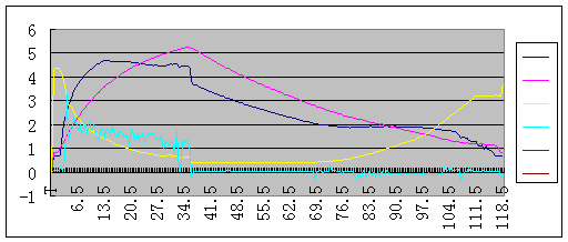 圖5為汽車速度從零加到120KM/H后又由120KM/H減到零時(shí),位置傳感器與輸入軸轉(zhuǎn)速、輸出軸轉(zhuǎn)速和電機(jī)電壓之間的關(guān)系曲線。由圖可知,當(dāng)汽車速度在從零加到120KM/H過(guò)程中,位置傳感器變比由最大開(kāi)始下調(diào)直到變?yōu)樽钚?,此時(shí)對(duì)應(yīng)電機(jī)反轉(zhuǎn)。當(dāng)車速由120KM/H開(kāi)始下降時(shí)位置傳感器先保持不變,此時(shí)電機(jī)不轉(zhuǎn),同時(shí)輸入軸轉(zhuǎn)速和輸出轉(zhuǎn)速成比例的下降,當(dāng)車速達(dá)到一定的值時(shí)位置傳感器速比由最小開(kāi)始上調(diào)直到為最大值,此時(shí)電機(jī)反轉(zhuǎn)(因測(cè)試時(shí)采用的電流傳感器為單方向的,所以圖中沒(méi)有反映出反向電流)。輸入軸轉(zhuǎn)速和輸出軸轉(zhuǎn)速不成比例的下降直至為零。從圖5可以看到車速在上升時(shí),位置傳感器速比的測(cè)試值不斷地減小(對(duì)應(yīng)的轉(zhuǎn)速比增大)。反之,車速在下降的過(guò)程中,當(dāng)車速小于某一值時(shí)測(cè)試值增加。從而實(shí)現(xiàn)了變速箱變比的自動(dòng)調(diào)整。