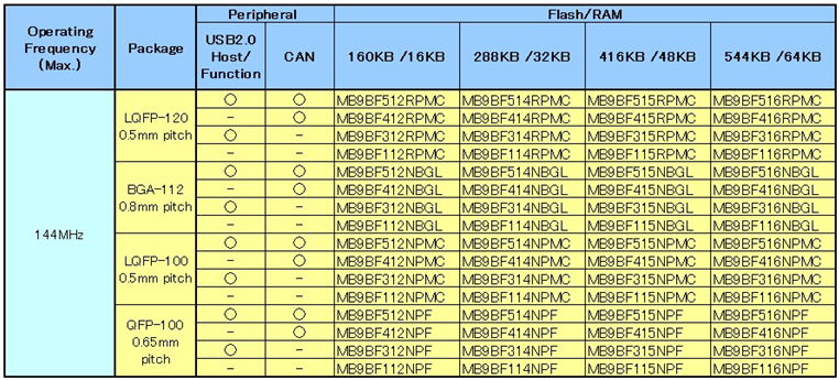 高性能產品組:MB9B510R/410/310/100 系列 (64款產品)