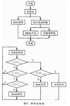 按照上述控制策略,得到如圖4的程序流程圖,其中5kHz逆變為均壓電路中的逆變器,采用50%的PWM脈沖波來實現,不需要復雜的控制算法。20kHz升壓模塊完成開關管S1信號的產生。需要通過電壓采集電路,得到串聯電容的總電壓。4個判斷模塊通過判斷Vdc和Vc的電壓范圍決定對電容的充放電控制。