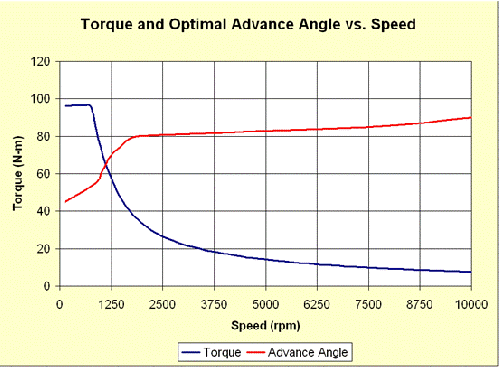 這幅圖中可以提取每個轉速下優化超前角的峰值轉矩。當電機超過恒轉矩區域(大概875轉/分)后,弱磁的優勢突顯出來。