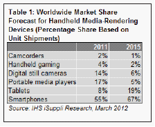 據IHS iSuppli公司的消費平臺專題報告,憑借多種多樣的功能與特點,智能手機和平板電腦等多用產品將繼續侵蝕數碼相機等其它專用消費電子產品的銷售,最終在2015年導致這些傳統的媒體再現(media-rendering)設備市場永久衰落。
